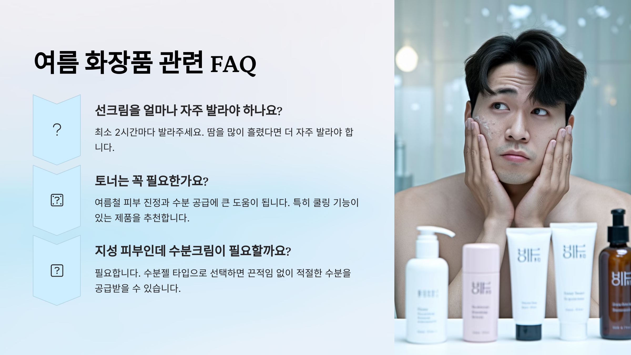 A1. 여름에는 땀과 피지 분비가 늘어나기 때문이에요. 특히 남성은 피지선이 활발해 유분이 더 많아 보일 수 있어요.