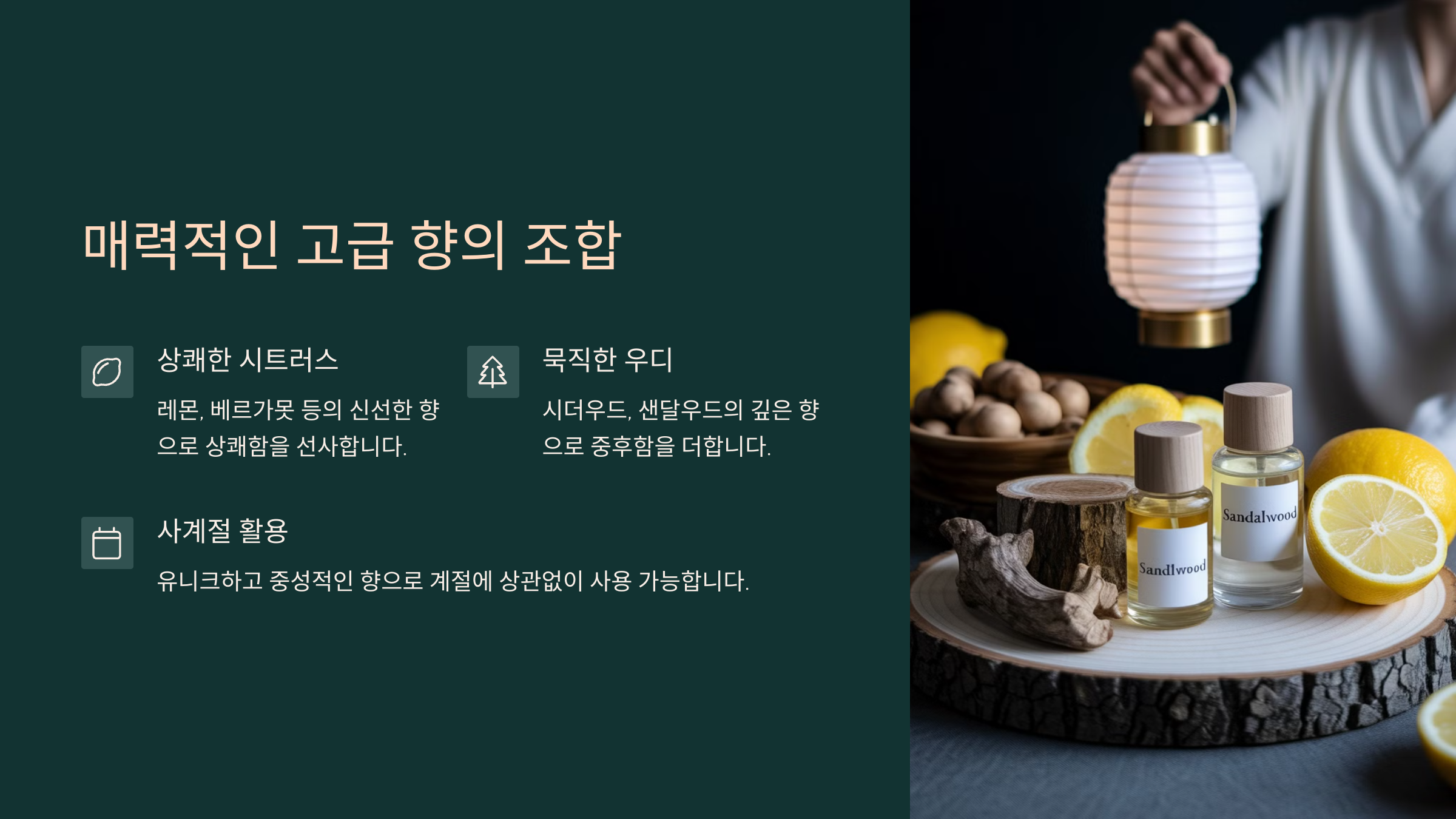 | 시더우드 + 레몬 | 상쾌하고 활력 있음 | 아침 출근 전 |