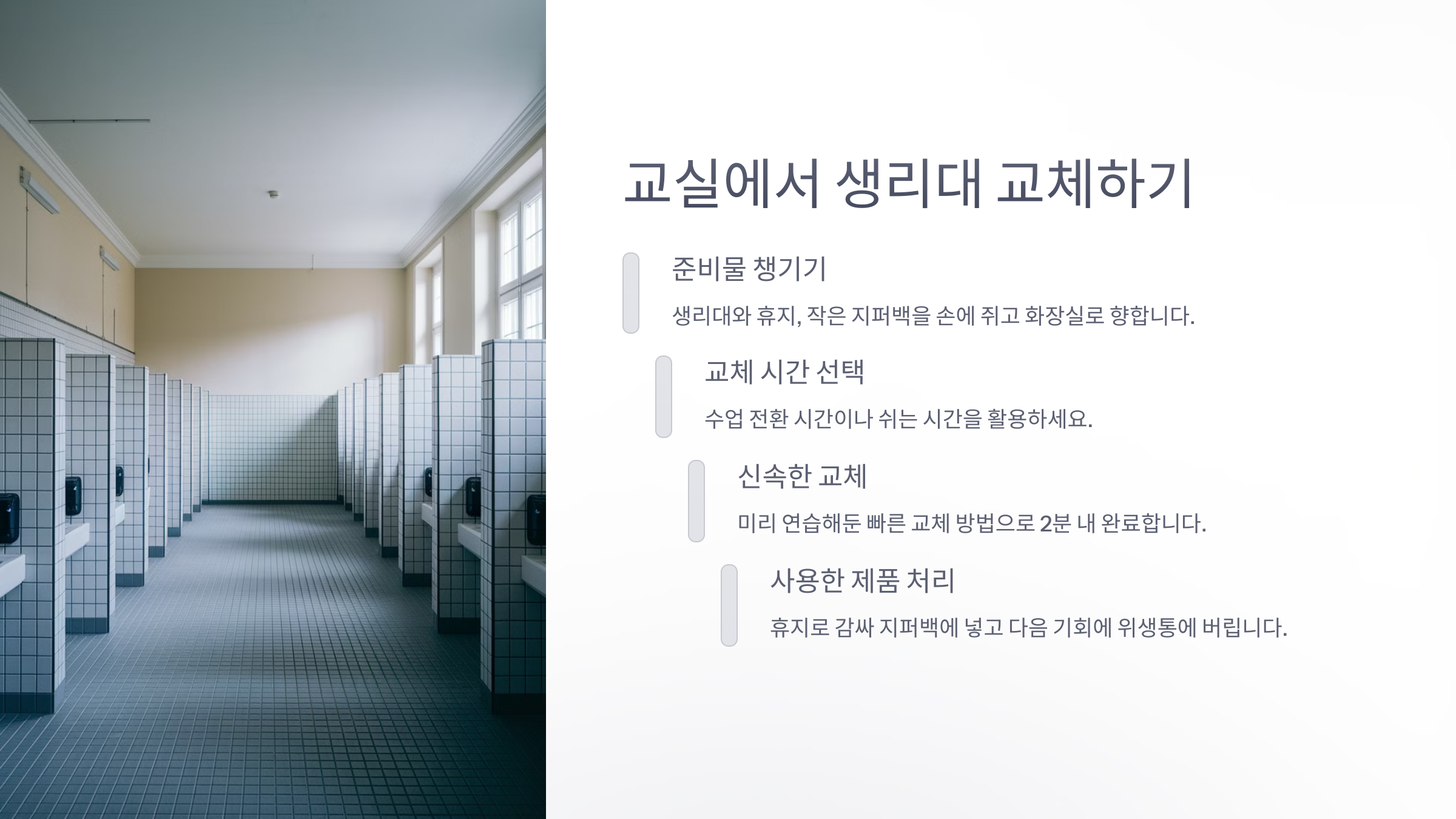 학교에서 수업 중 갑자기 생리대 교체가 필요해지면 정말 난감하죠. 특히 조용한 교실, 선생님 눈치, 친구들의 시선까지... 자연스럽게 자리를 비우는 요령이 필요해요. 😳