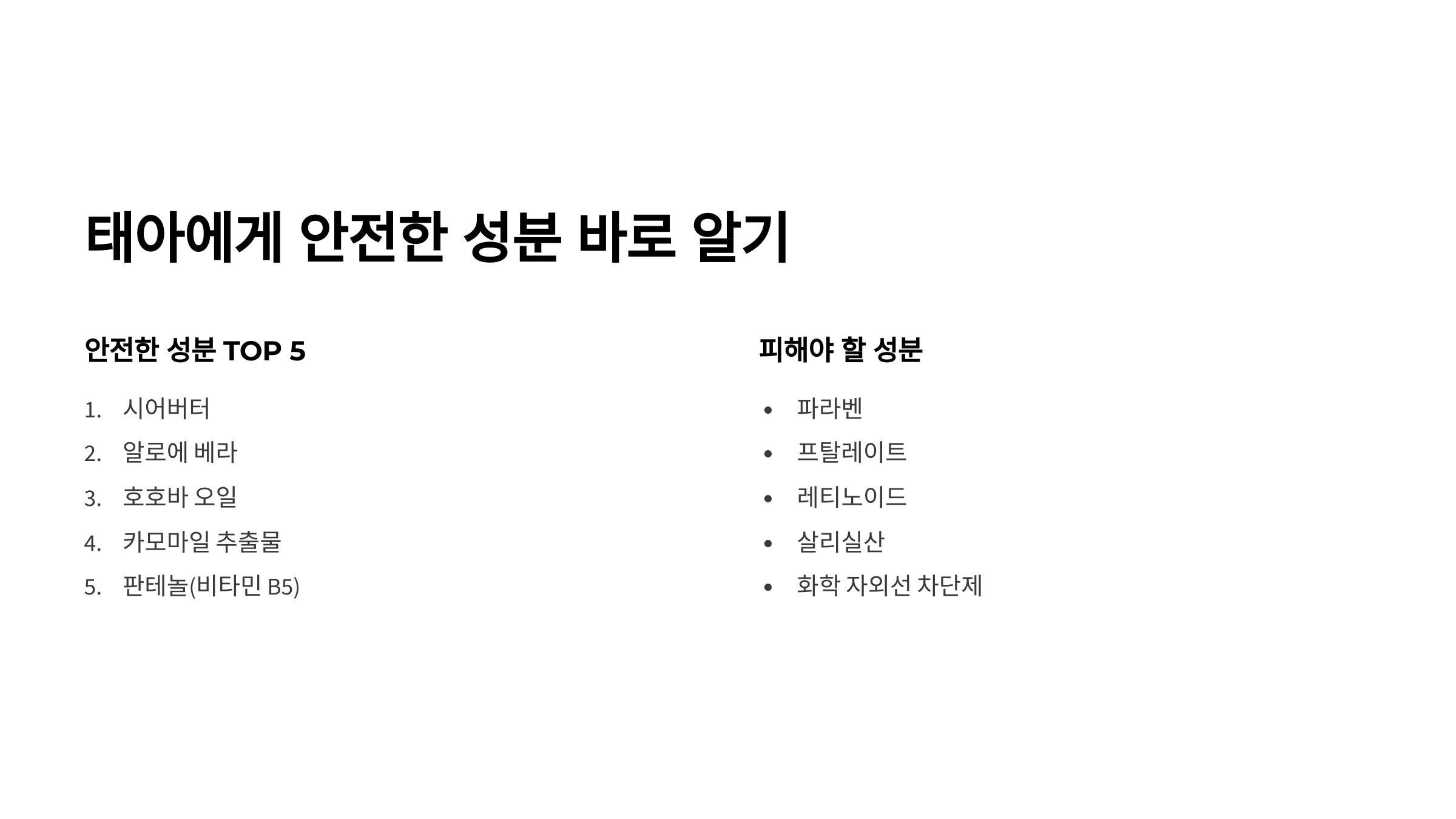 성분을 잘 알면, 제품을 보는 눈도 훨씬 높아져요. 피부에 좋은 성분은 결국 태아에게도 좋은 선택이 되니까요! 👶