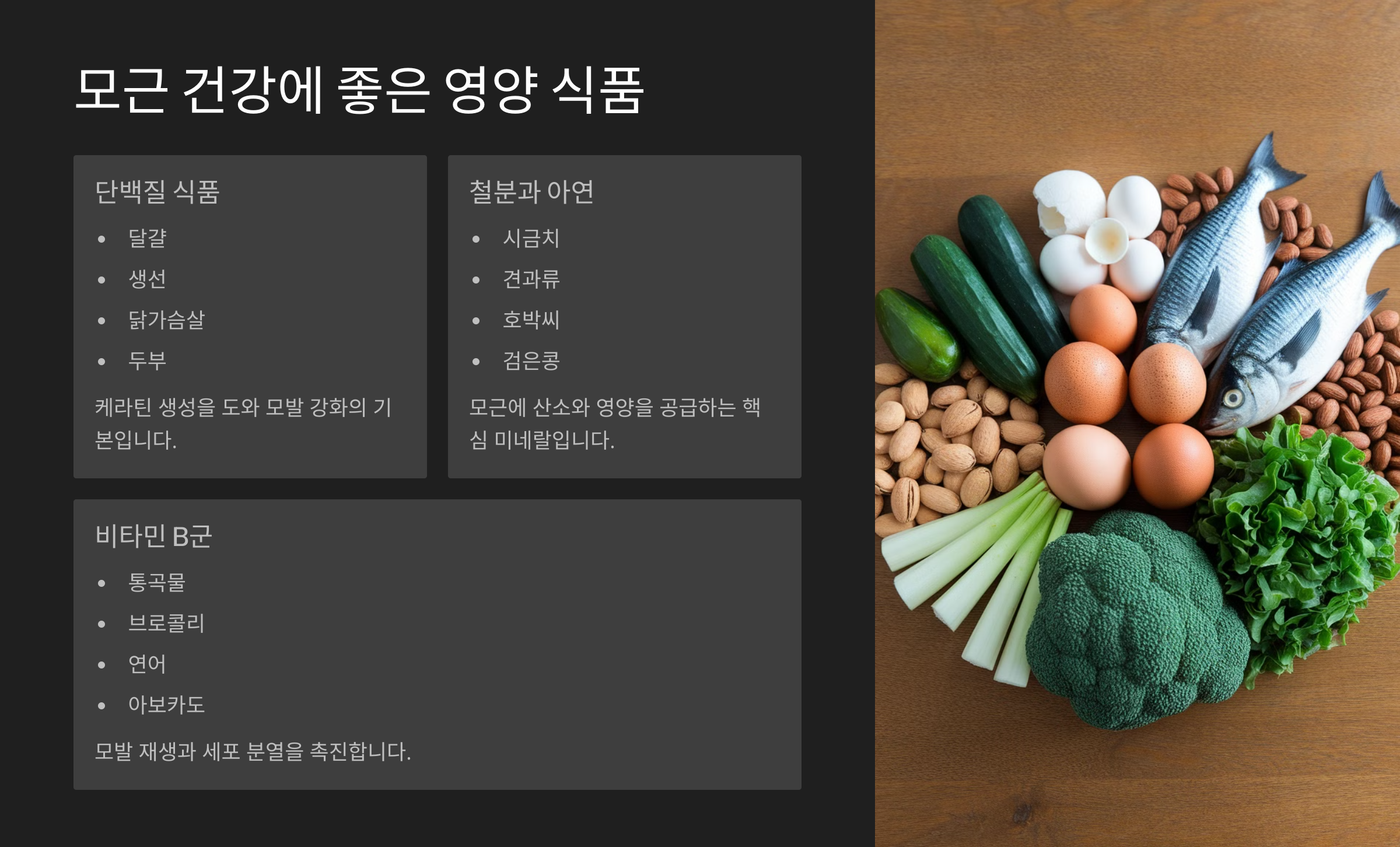 | 단백질 | 달걀, 두부, 닭가슴살 | 모발 형성의 재료 |