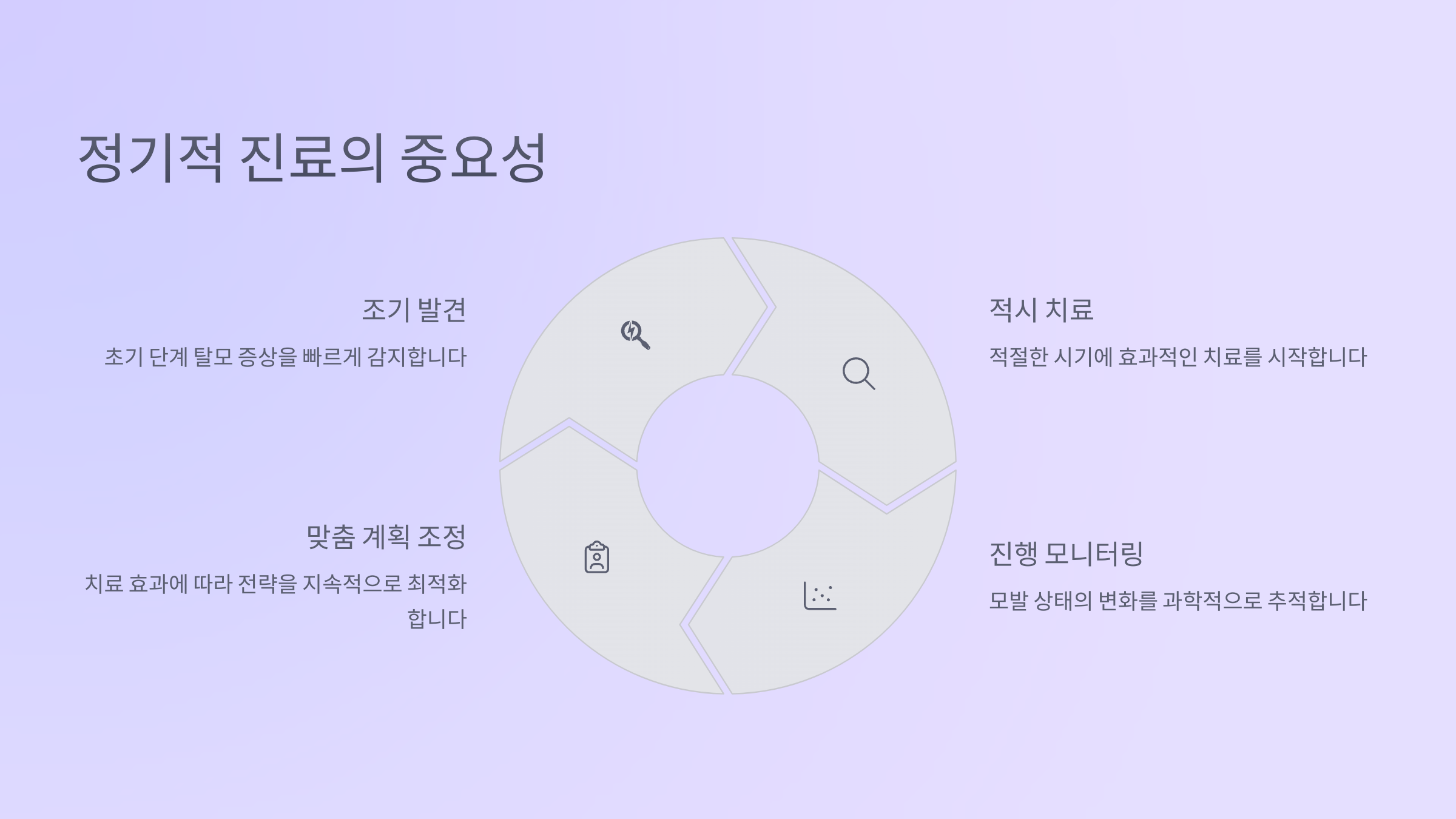 정기 진료에서는 모근 상태를 다시 분석하고, 이전보다 나아졌는지 혹은 약물에 대한 반응이 어떤지를 체크해요. 그 결과에 따라 치료 계획을 조정하거나, 약물의 용량을 변경하게 되죠. 🔍