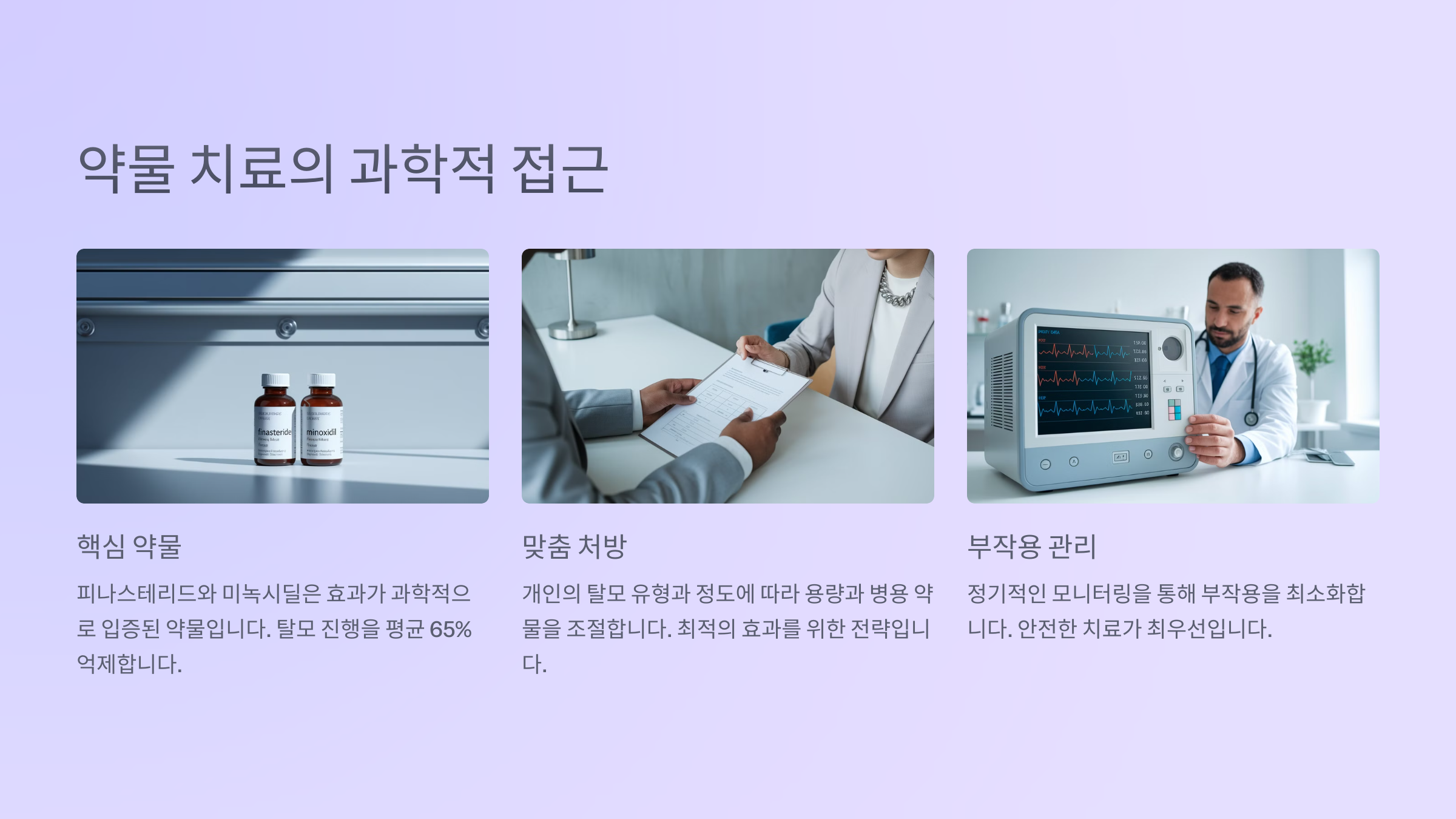 약물 치료는 탈모 진행을 막고, 모근의 건강 상태를 회복시키는 데 있어 필수적인 첫걸음이에요. 물론 체질에 따라 부작용이 생길 수도 있기 때문에 반드시 전문의 상담 후 시작해야 해요. 🩺