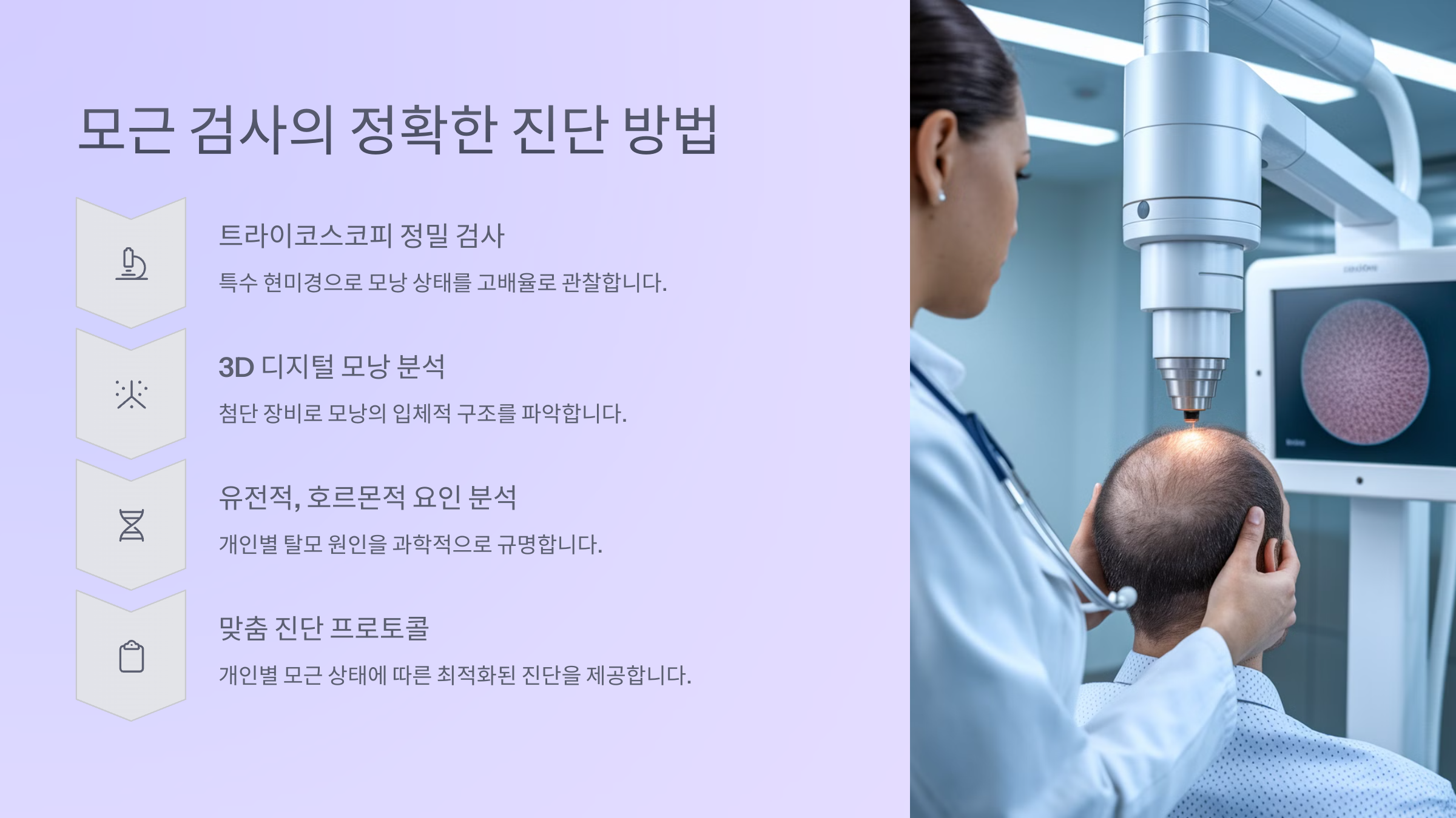 모근 검사는 탈모가 의심되거나 모발이 급격히 가늘어지는 경우, 정확한 진단을 위해 반드시 필요한 과정이에요. 단순히 육안으로 확인하는 것을 넘어 전문적인 분석 장비를 사용해서 모근의 상태를 객관적으로 파악해요.