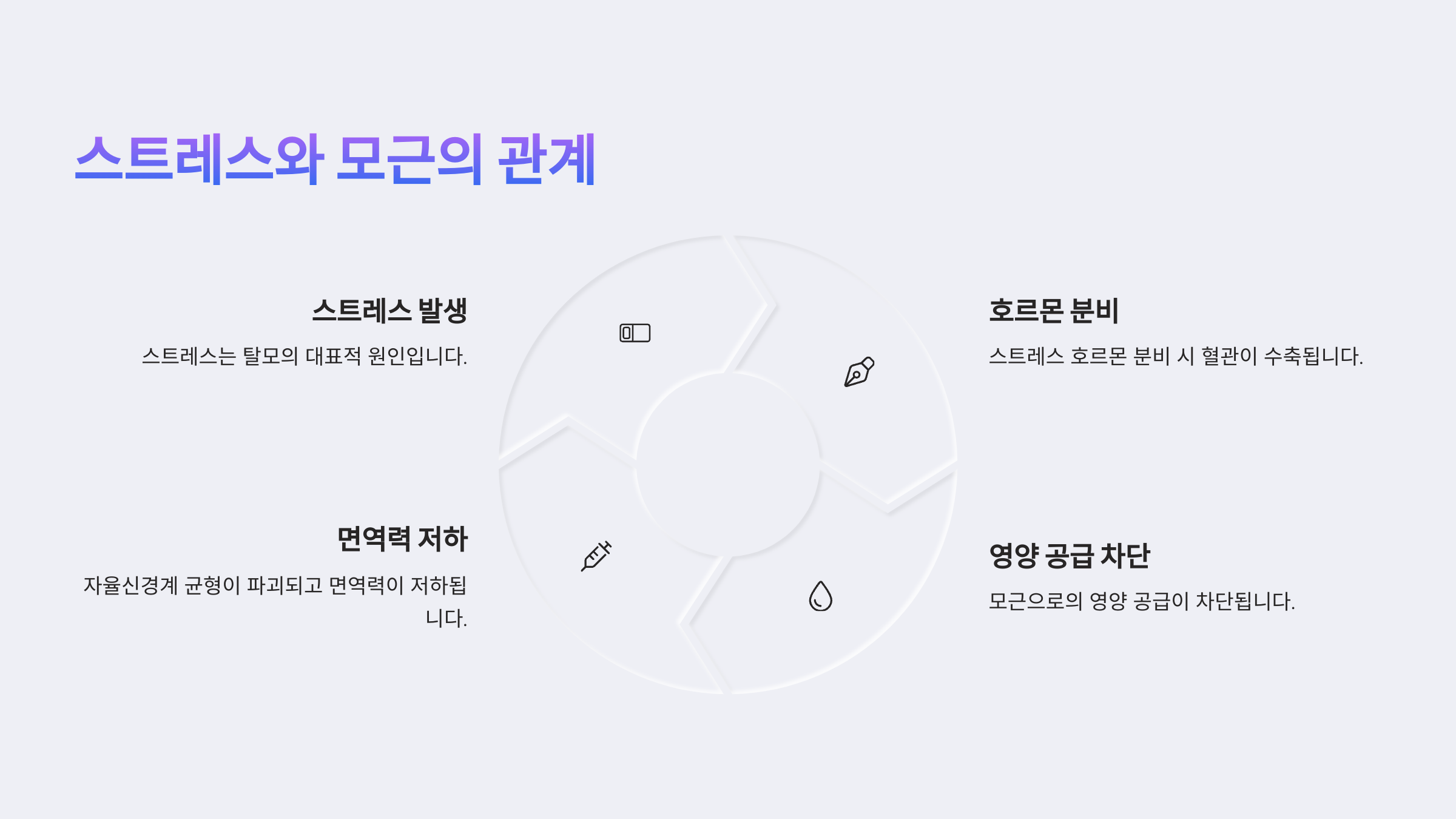 스트레스는 탈모의 가장 강력한 유발 요인 중 하나예요. 만성 스트레스 상태가 지속되면 모낭의 세포 재생이 느려지고, 모근에 영양을 전달하는 혈관도 수축돼요. 이로 인해 모근이 약해지고 머리카락이 쉽게 빠지게 되죠.
