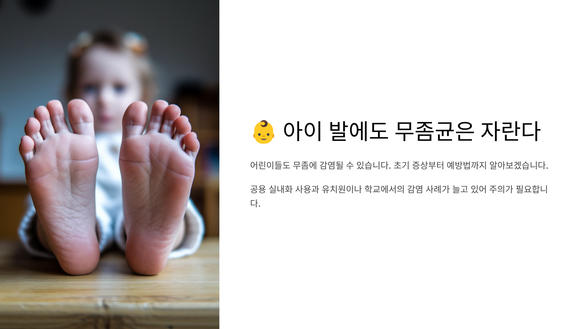 무좀은 어른들만의 질환이 아니에요. 아이들도 충분히 무좀에 걸릴 수 있고, 특히 공용 실내화나 어린이집, 유치원 같은 공간에서는 무좀균이 쉽게 전염될 수 있어요.