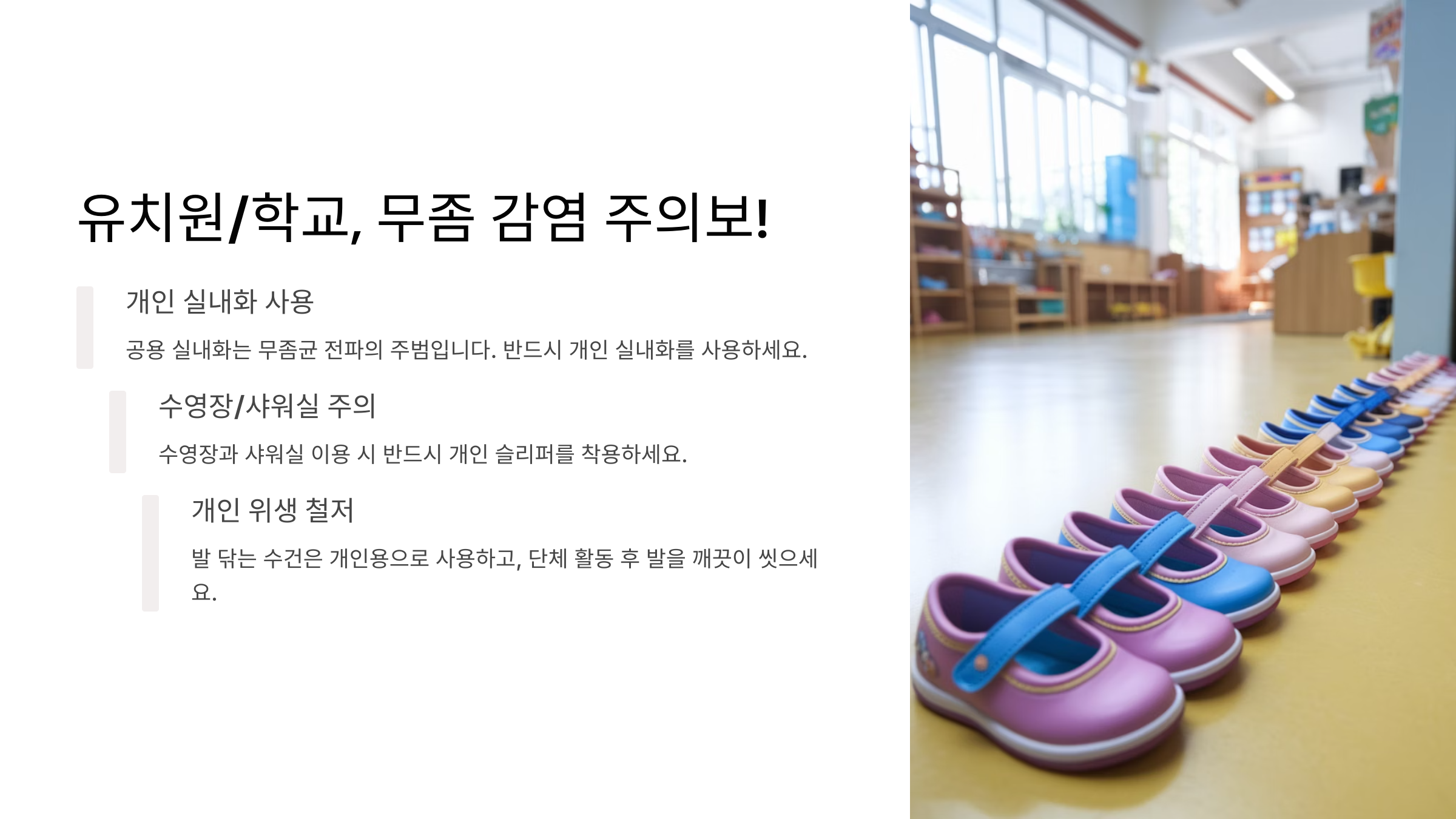 다음 섹션에서는 실제로 유치원과 학교에서 발생했던 무좀 감염 사례와 함께, 단체생활 속 감염 위험을 어떻게 줄일 수 있는지 알려드릴게요! 🧑🏫