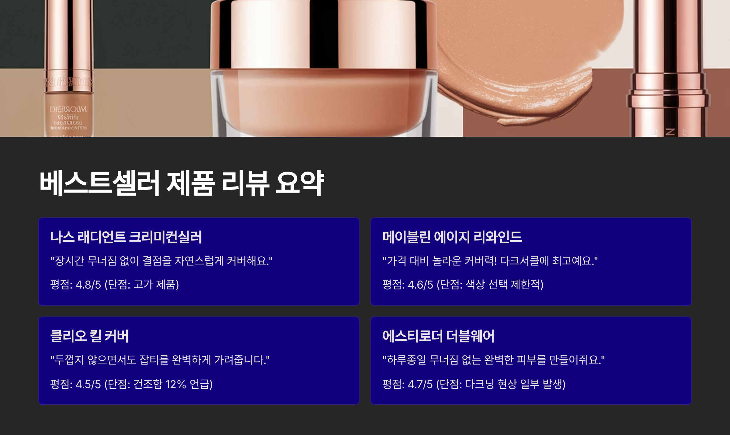 지금부터 소개할 제품들은 수천 개의 리뷰를 자랑하는 진짜 '잘 팔리는' 고커버 컨실러들이에요. 실제 사용자의 평가를 기준으로 요약한 만큼, 구매 전 참고용으로 딱 좋아요! 🛍️