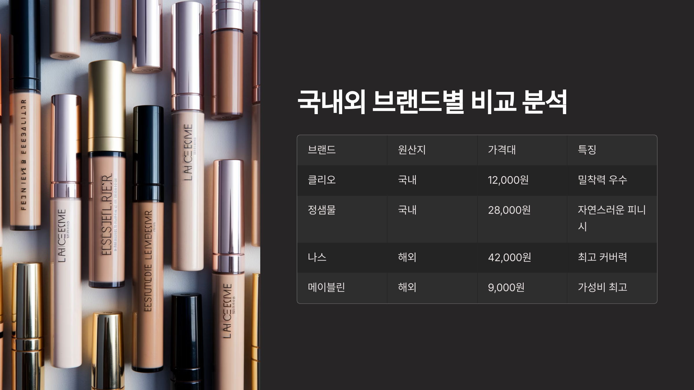 고커버 컨실러는 브랜드마다 철학도 다르고 주력으로 잡는 기능도 제각각이에요. 그래서 커버력 하나만으로 고르기보다는, 브랜드별 특징을 비교해보는 게 진짜 중요한 포인트랍니다.