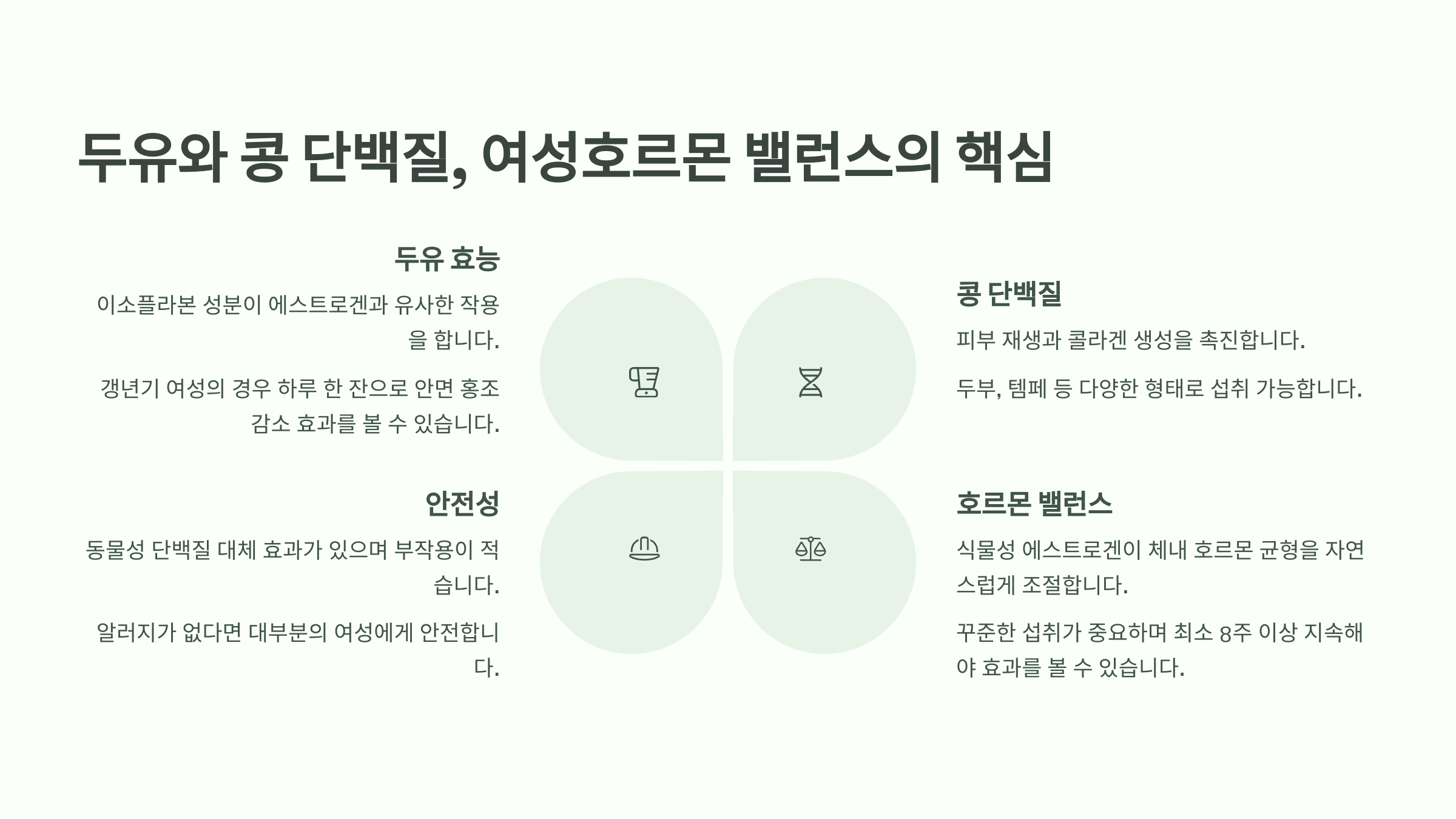 두유와 콩 단백질은 여성 건강을 위해 가장 추천되는 식품 중 하나예요. 특히 식물성 에스트로겐인 이소플라본이 풍부해서 여성호르몬 밸런스를 맞추는 데 핵심적인 역할을 해요. 😌